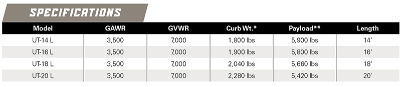 Need the type of trailer the pros use? Step up to the CornPro UTL. Made with the same 24” on center cross-members rolling on the same high-quality torsion axles and radial tires, the UTL adds 3-inches of fender-to-fender space with four optional lengths. Solid, kiln-dried flooring and a tread plate ramps make this trailer ready to haul your largest lawn equipment.