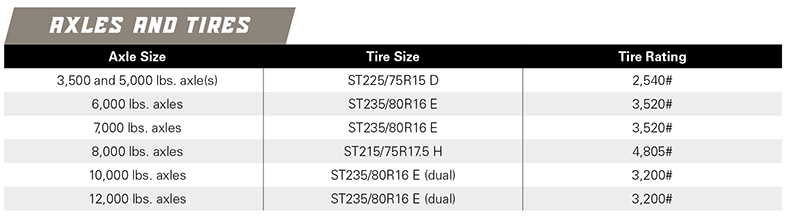 TIRES: Tires are where our quality touches the road. Quality radial tires are standard with every trailer. Each trailer carries the tire manufacturer’s factory warranty along with our overall trailer warranty.